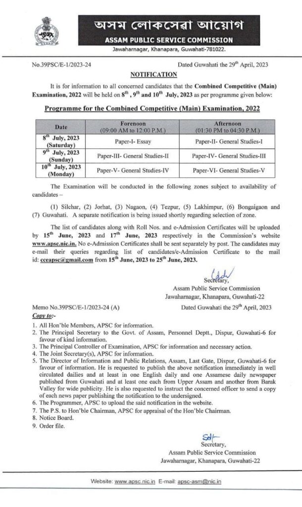 The notification from APSC read, “It is for information to all concerned candidates that the Combined Competitive (Main Examination, 2022 will be held on 8th, 9th and 10th July, 2023.”