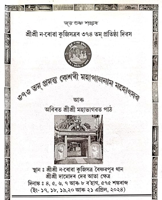 নগাঁৱৰ পৰা জয়ন্ত মুদৈ, ১৬ এপ্ৰিলঃ নগাঁও আৰু মৰিগাঁও জিলাৰ সীমান্তত অৱস্থিত অসমৰ অন্যতম প্ৰাচীন ইতিহাস প্ৰসিদ্ধ শ্ৰী শ্ৰী ন-ৰোৱা কুজিসত্ৰৰ গৌৰৱোজ্জল ৩৭৪ তম্ প্ৰতিষ্ঠা দিৱস উপলক্ষে প্ৰমত্ত কেশৰী মহাপালনাম মহোৎসৱ আৰু অবিৰত মহাভাগৱত পাঠৰ আয়োজন কৰা হৈছে ৷ অহা ১৭ এপ্ৰিলৰ পৰা পাঁচদিনীয়া বৰ্ণিল সত্ৰীয়া পৰম্পৰাগত কাৰ্যক্ৰমণিকাৰে এই মহোৎসৱভাগ শ্ৰী শ্ৰী ন-ৰোৱা কুজিসত্ৰ বৈষ্ণৱপুৰ