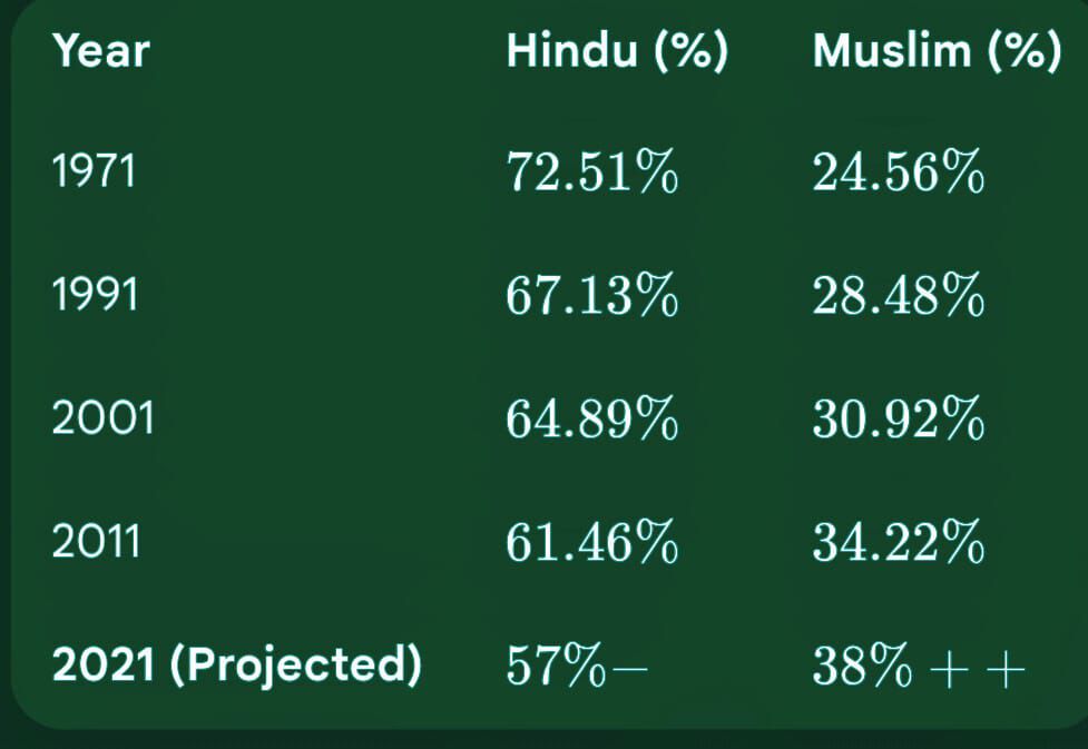 বিগত পাঁচ দশকত অসমত হিন্দু-মুছলমান জনসংখ্যাৰ অনুপাত ভয়ংকৰভাৱে সলনি হৈছে। সমীক্ষা অনুসৰি ১৯৭১ চনৰ পিয়ল মতে অসমত হিন্দু ৭২.৫১ শতাংশ থকাৰ বিপৰীতে মুছলমান আছিল ২৪.৫৬ শতাংশ, ১৮৯১ চনত হিন্দুৰ সংখ্যা হ্ৰাস পাই ৬৭.১৩ শতাংশ আৰু মুছলমানৰ জনসংখ্যা বৃদ্ধি হৈ ২৮.৪৮ শতাংশ হয়৷ ঠিক একেদৰে ২০০৬ চনত হিন্দুৰ সংখ্যা ৬৪.৮৯ শতাংশ হোৱাৰ বিপৰীতে মুছলমানৰ সংখ্যা বৃদ্ধি হৈ ৩০.৯২ শতাংশ হয়গৈ৷ ২০১১ চনত হিন্দু হয়গৈ ৬১.৪৬ শতাংশ আৰু মুছলিম বৃদ্ধি হৈ হয়গৈ ৩৪.২২ শতাংশ৷ ২০২১ (প্ৰজেক্টেড)ৰ হিচাপ মতে হিন্দুৰ সংখ্যা কমি গৈ ৫৭ শতাংশ হোৱাৰ বিপৰীতে মুছলমানৰ সংখ্যা হয়গৈ ৩৮ শতাংশৰো অধিক৷ আৰু আজি অৰ্থাৎ ২০২৫ চনত নিশ্চিতকৈ মুছলমানৰ সংখ্যা ৪৪-৪৫ শতাংশলৈ বৃদ্ধি হৈছে৷ এই বিপজ্জনক গতি যদি অব্যাহত থাকে, তেন্তে অহা ১২-১৩ বছৰৰ ভিতৰতে অসম মুছলমান সংখ্যাগৰিষ্ঠ ৰাজ্যত পৰিণত হ’ব। অসমত হিন্দুসকল হৈ পৰিব সংখ্যালঘু৷