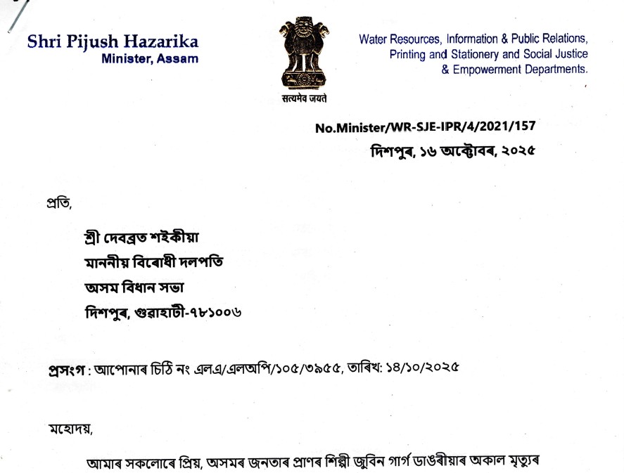 অসম বিধানসভাৰ বিৰোধী দলপতি দেবব্ৰত শইকীয়াই যোৱা ১৪ অক্টোবৰ তাৰিখে জলসম্পদ মন্ত্ৰী পীযুষ হাজৰীকালৈ পত্ৰ লিখি বিভাগৰ এজন কৰ্মচাৰীয়ে ছিংগাপুৰ ভ্ৰমণ কৰা আৰু প্ৰয়াত শিল্পী জুবিন গাৰ্গৰ মৃত্যুৰ তদন্তৰ প্ৰসংগত উত্থাপন কৰা কেতবোৰ প্ৰশ্নৰ উত্তৰত জলসম্পদ মন্ত্ৰীগৰাকীয়ে বিৰোধী দলপতিগৰাকীলৈ আজি এক পত্ৰ প্ৰদান কৰি বিৰোধী দলপতিগৰাকীক তীব্ৰ সমালোচনা কৰে৷